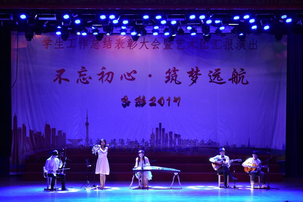 表彰大会结束后,主题为“不忘初心·筑梦远航”艺术团汇报演出拉开序幕。晚会囊括舞蹈、乐器演奏、歌曲演唱、模特秀等形式多样的文艺节目,演员们精彩纷呈的表演彰显建筑与土木工程学院学子们的风采。活动在《我爱我的建工院》的歌声中完美落幕。