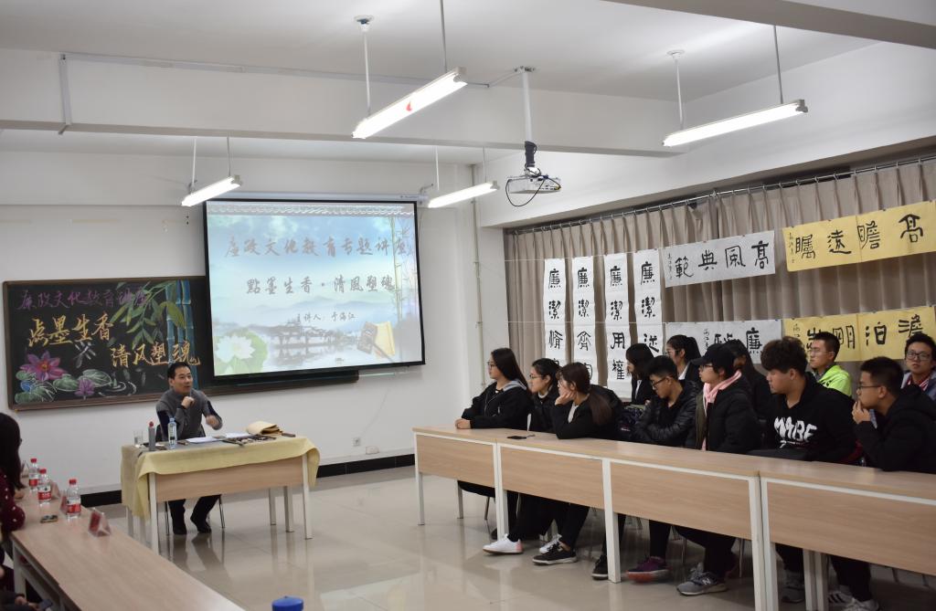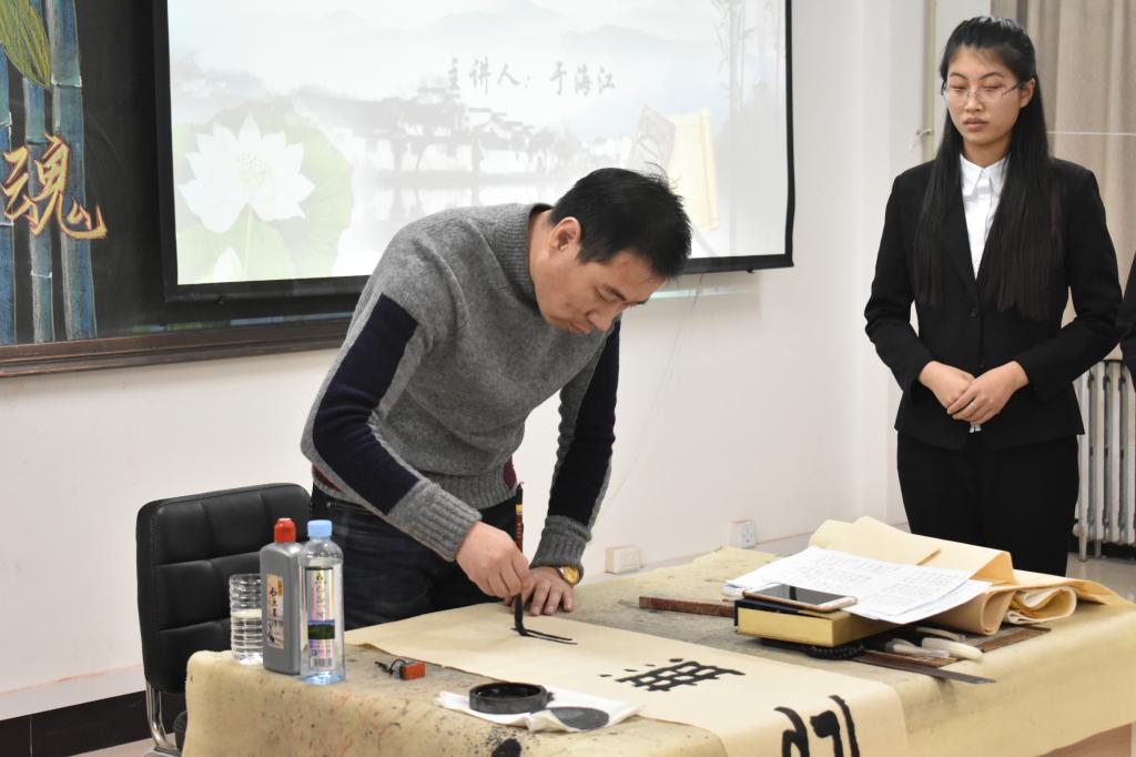 讲座中,于海江先生首先从“点墨生香”入手,将书法简史与运笔技巧进行了细致入微的讲解,又以“清风塑魂”为基点,讲述了书法及传统文化在廉政文化建设方面的积极作用,并为大家解读了廉政文化的意义。最后,他号召大家要肩负历史使命感,心怀感恩,为家国做出自己的贡献。