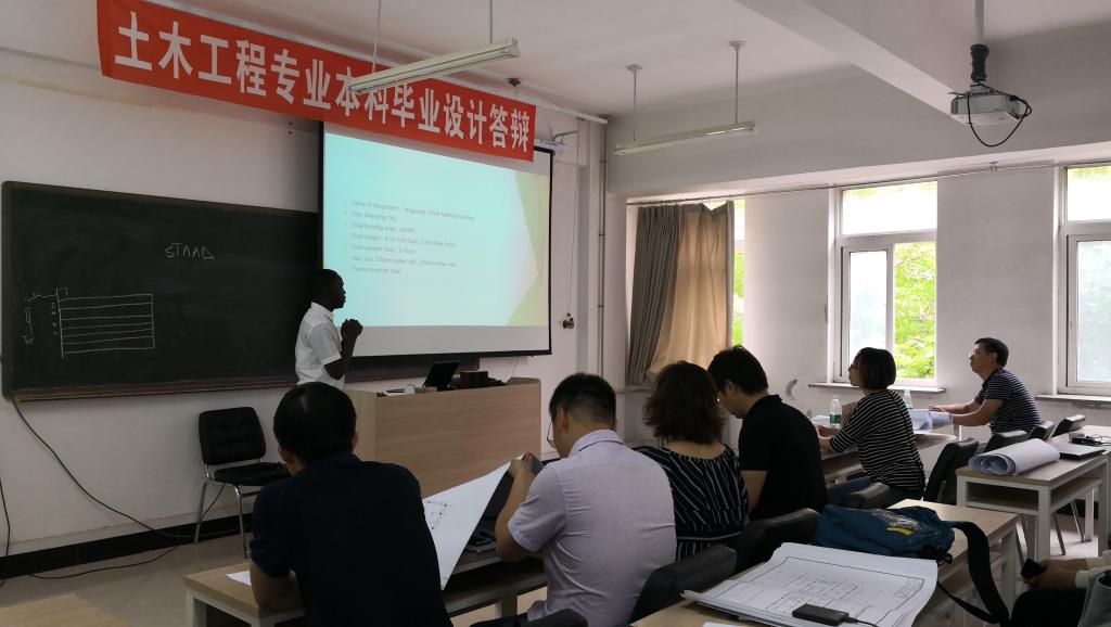 答辩中,留学生利用PPT对自己的房屋建造设计进行陈述,答辩委员会针对学生毕业设计、计算书及图纸等提出针对性的问题以及修改意见,学生认真回答并聆听老师们中肯的建议。