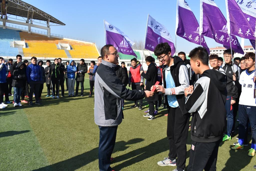首先进行的是冠亚军争夺赛和季军争夺赛。经过激烈角逐,道桥1601—地下1601联队获得冠军。团委书记李青山为获胜班级颁奖。